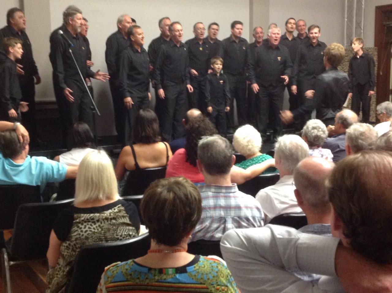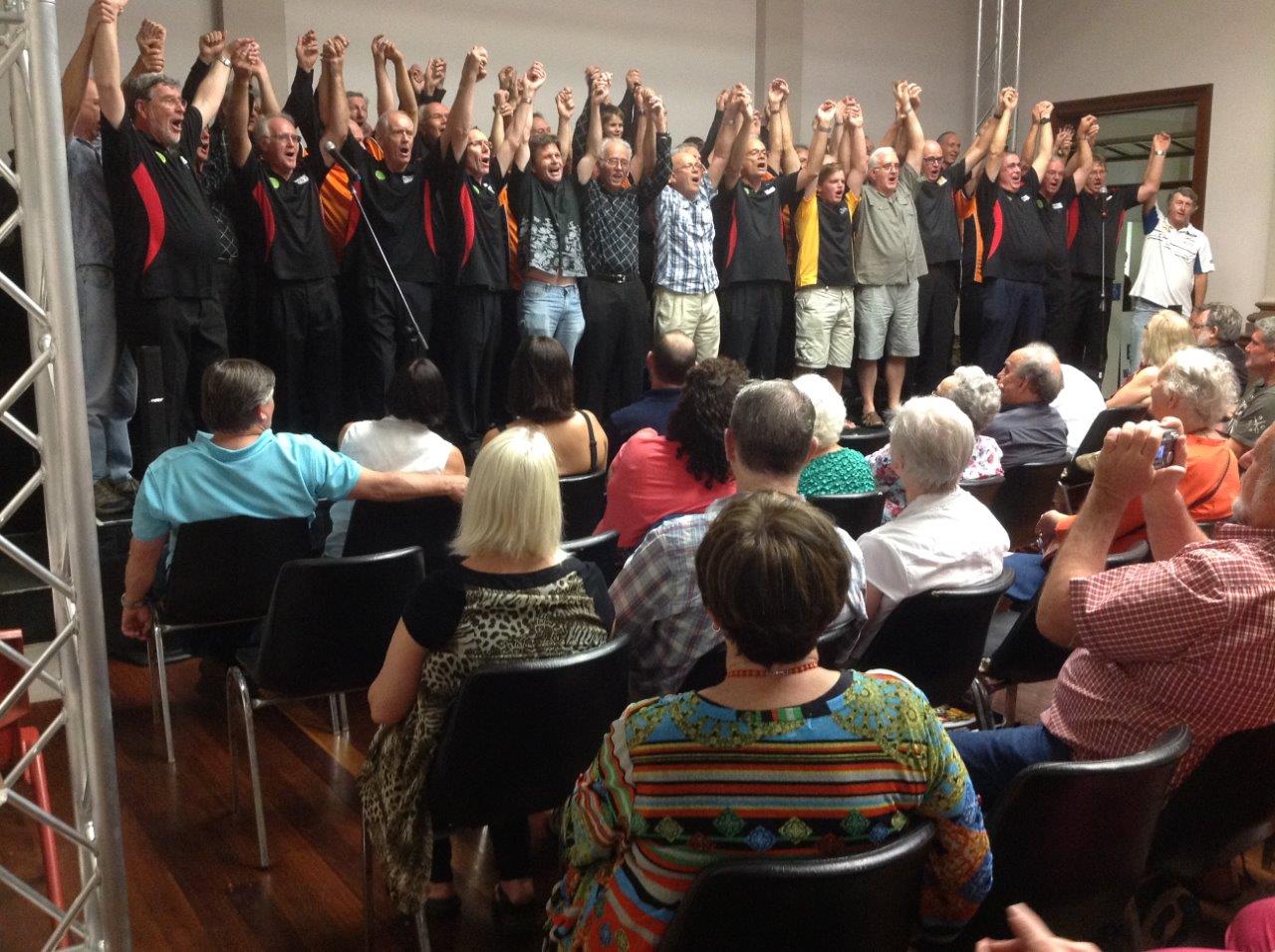 With Miner Chords Chorus and High Altitude Harmony Chorus, the blokes from Sound Connection Chorus presented an entertaining evening at the old Courthouse in Ipswich. The event was to raise funds for much needed research for Prostate Cancer with almost $1000.00 being added to the coffers. Sound Connection was delighted to be asked to support their brother chorus at Ipswich. The concert started with all three choruses presenting the traditional melody ‘The Old Songs', sung by barbershop choruses around the world at the beginning of each rehearsal. Singing to a packed house Sound Connection ended the concert with their favourite song ‘the Impossible Dream' ably directed by Drew Carolan